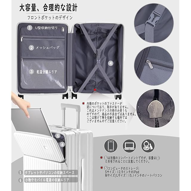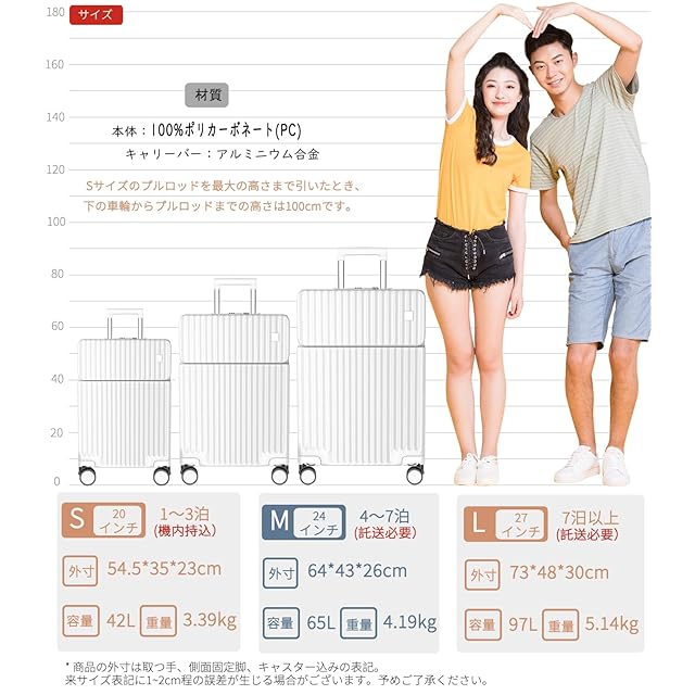 【サイズ】Sサイズの外寸は54.5*35*23cm、重さ:3.39kg 超軽容量、は42リットル、1~3泊に似合います。Sサイズは一部の航空会社だけに適用しますので、事前に航空会社に確認したほうがいいんです。Mサイズの外寸は64*43*26cm、重さ:4.19kg 、容量は65リットル、4~7泊以上。Lサイズの外寸は73*48*30cm、重さ:5.14kg、 容量は97リットル、7泊以上