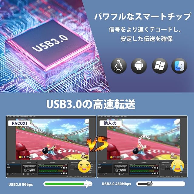 【USB3.0高速伝送】ゲームキャプチャーは、USB3.0インターフェースを通じて高速データ伝送を実現し、最大伝送速度は毎秒5Gbpsです。Twitch、YouTube、OBS、PotPlayer、XSplit、QuickTime Playerなどのプラットフォームでのライブ配信と録画に適しており、ゲームとビデオ録画中にほとんど遅延がありません。
