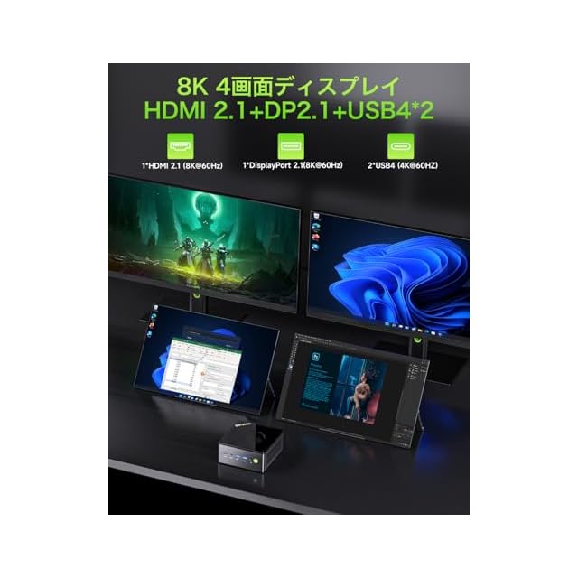 【4画面 & 8K出力】:これ小型pc は、1*HDMI2.1 (サポート8K最大120Hz、サポート4K最大60Hz)、1*DP 、2*Type-Cを介した4台のディスプレイの同時接続をサポートしており、複数のタスクを簡単に実行できます。 Type-CポートはUSB4.0出力に対応しており、最大伝送速度は40gbps、USB3.2 Gen2の4倍です。 全功能 Type-C ポート はUSB4.0の完全な機能をサポートし、USB 3.2 Gen2/PD3.0/DP1.4/PD 100W+入力、PD15W出力をサポートします。