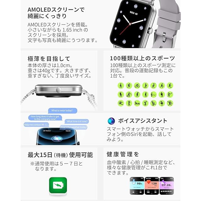 【主要機能】「メッセージ/着信通知(対応済みアプリ:LINE/着信/SMS/Facebook/X(Twitter)/Instagram/WhatsApp/WeChat/Skype/KaKaoTalk/QQ」「AMOLED常時表示ディスプレイ」「メッセージ/着信通知」「通話」「連絡先保存」「音声アシスタント」「ステップ数」「消費カロリー」「睡眠記録」「スポーツ測定」「天気予報」「音楽操作」「生理周期管理」「遠隔撮影」「ストップウォッチ」「タイマー」「アラーム」「計算機」「腕振り点灯」「スマートフォンを探す」「呼吸エクササイズ(リラックス)」「壁紙変更」「明るさ調整」「世界時計」「座りがち通知」他