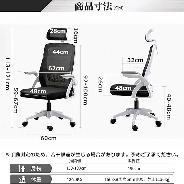 【簡単に組立可能・商品仕様】オフィスチェアのサイズ:幅60×奥行60×高さ113-121cm(座面高:40-48cm)。高さ調節が可能なので、小柄な女性にも座りやすいモデルとなります。また、本体重量は15kgですが、静止耐荷重は約150KGに達しており、ご安心して利用いただけます。組み立てには、道具も日本語説明書も付いていますから誰でも20分以内に八つのシンプルステップでこのオフィスチェアを組み立てることができます。
