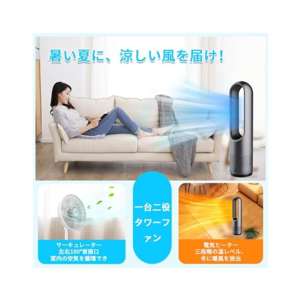 【温風・冷風両用】このタワーファンは三段階の温風と10階段の送風を自由に切り替えられて便利です。寒い冬に、温風で寒きを遮断しながら、屋内を迅速に暖かくさせます。暑い夏に、強風モードで10階段の涼風を与えてくれ、究極の熱中症対策です。扇風機とヒーターが一体型になった羽なしセラ スリム扇風機が機能性や省エネで、一年中に大活躍です。Q:電源が入らない??A1:電源プラグがコン乜ントに確実に差し込まれてない;A2:本体が傾いている。解決案1:電源プラグをコン乜ントに確実に差し込んでください;解決案2:水平で安定した場所に設置しなおしてください。Q:電源が切れた???A1:転倒時安全装置(傾きセンサ一)が働いた;A2:切タイマ一が働いた。解決案1:水平で安定した場所に設置しなおして、再度電源を入れてください;解決案2:継続して使用する場合は、再度電源ボタンを押して電源を入れてください。