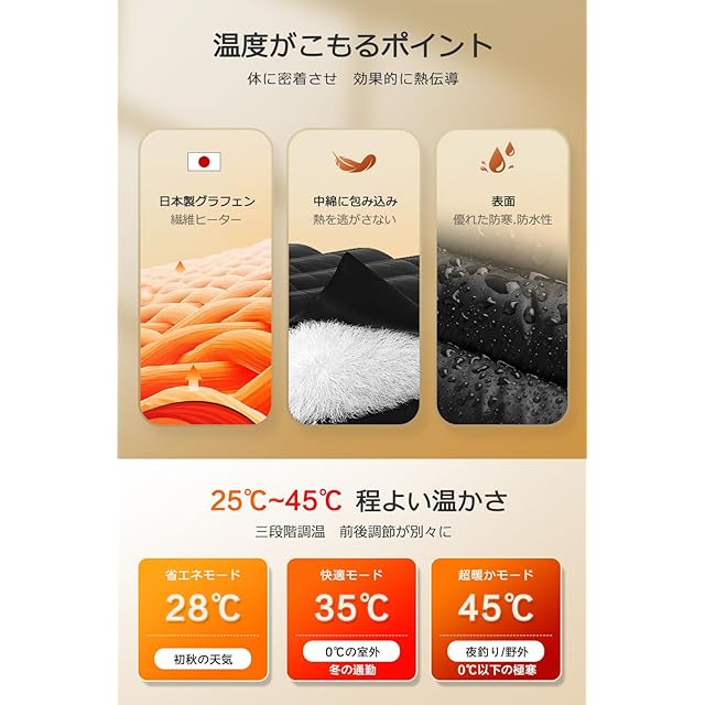 【時短加熱 丸洗い可能】しなやかな日本製グラフェン繊維ヒーターを採用し、電源を入れた後、効果的な熱伝導により約10秒で発熱開始、暖かさが素早く広がります。中身にふんわりした中綿入り、防寒性に優れて、ヒーターとの組み合わせで熱を逃がさず、暖かさをしっかりキープします。バッテリー電量がなくなっても、ただの中綿入りベストとして普通に着ていても暖かいです。汚れたら、バッテリーを外し、USBコードをポケットに入れて、手洗いや洗濯機で丸洗いできます。