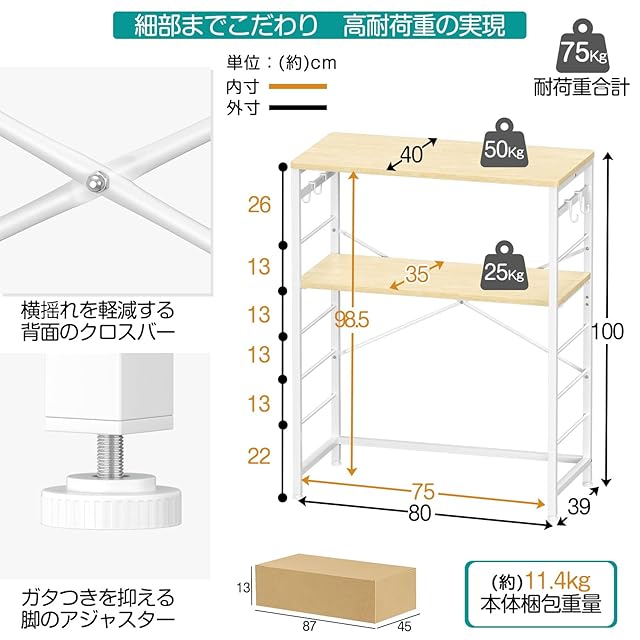 【キッチンラック仕様】組立完了後のサイズ(約):幅80×奥行40×高さ100cm(アジャスター含む);本体重量(約):9.7kg;全体耐荷重(約):70kg;梱包サイズ(約):87×45×13cm;吊り下げ用フック4個付き。