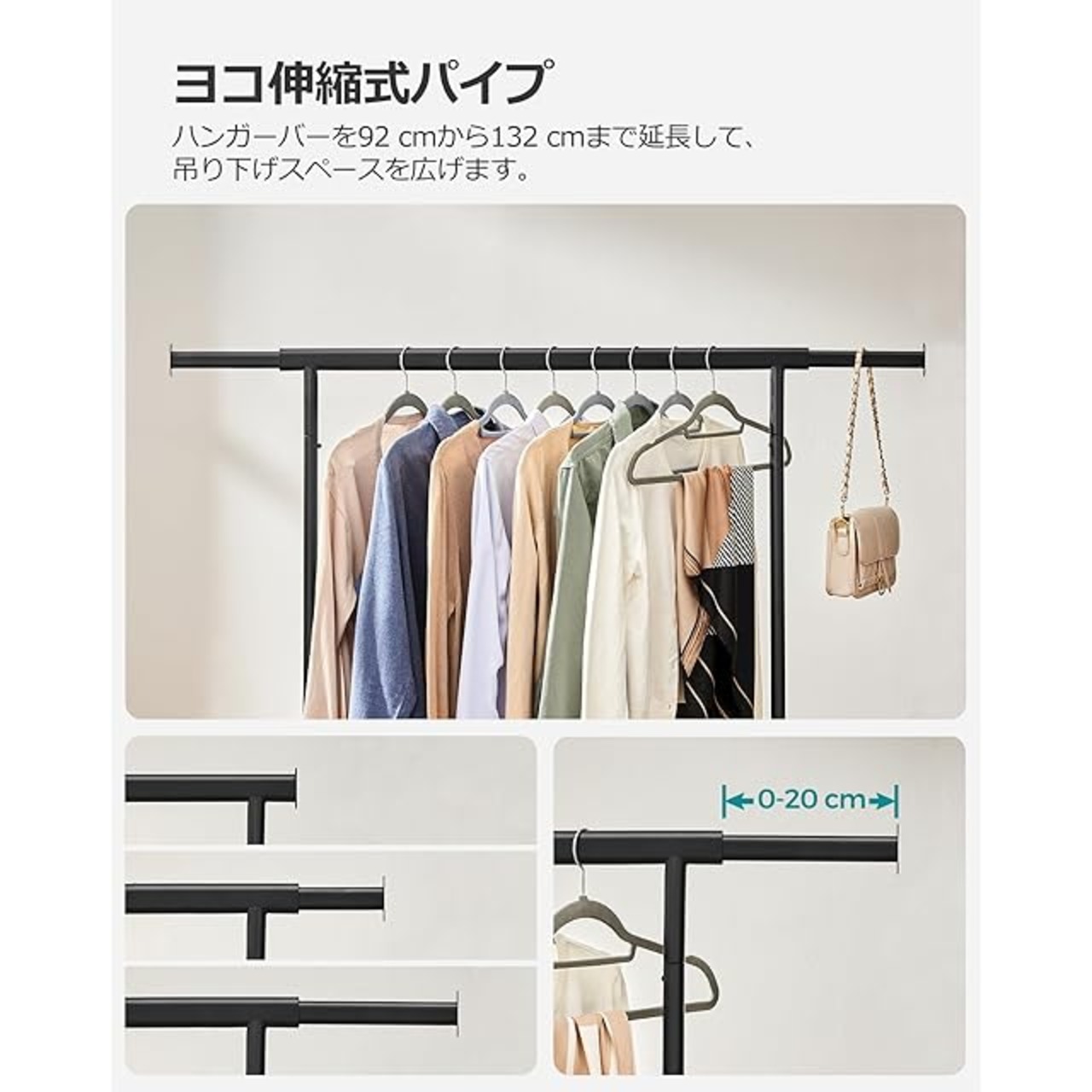 【伸縮可能なハンガーラック】ハンガーバーの両端がさらに20cm延長され、より多くの吊り下げスペースを提供します(ハンガーバーは92cmから132cmまで延長可能)。横に伸びる設計で、カバン、帽子、マフラー、その他のアクセサリーをかけるのにも最適です。