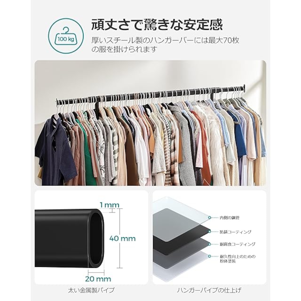 【強化された耐荷重能力】通常の0.8mmの鋼管よりも厚くて丈夫な1mmのスチールと頑丈なPP製キャスターのおかげで、このハンガーラックは最大100Kgまでサポートします。重いコートも安心してかけられます!幅広なので会社の更衣室などの業務用まで、お使いいただけます。