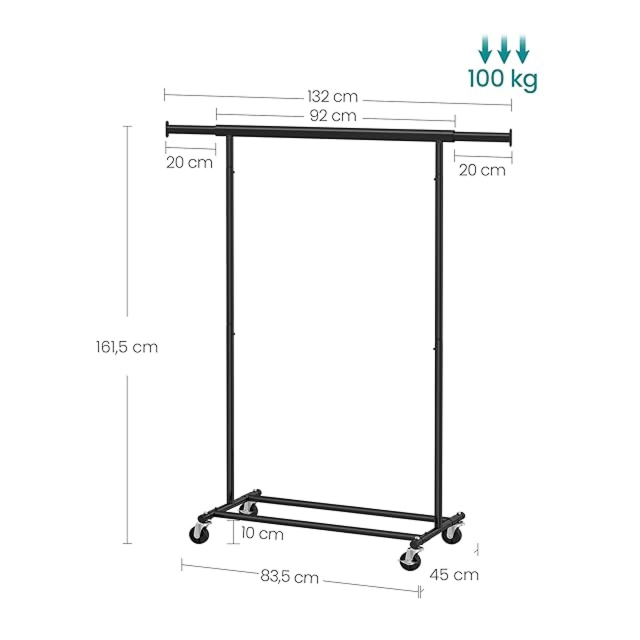 SONGMICS ハンガーラック 伸縮式 洋服ラック 頑丈 衣装掛け 幅92~132cm 耐荷重100Kg 大容量 衣類収納 安定性 業務用 キャスター付き 移動しやすい 室内物干し ちょうどいいサイズ HSR13BKV1