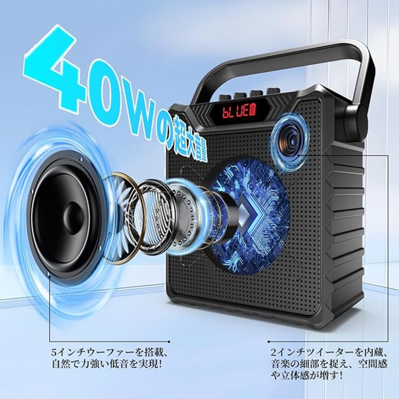 【優れた音質】ポータブルBluetoothカラオケセット高音質には5インチ低音スピーカーと2インチ中高音スピーカーが内蔵されており(合計2個)音を大きくするだけでなく、鮮明でリアルな音を提供し、低音拡張機能を備え、高い音量でも歪むことはありません。野外ライブ、BBQ、ストリートダンスの練習、宣伝活動、選挙活動、街頭演説、学校行事、セミナー、カラオケ、結婚式、盆踊りなどのイベントに活躍します。
