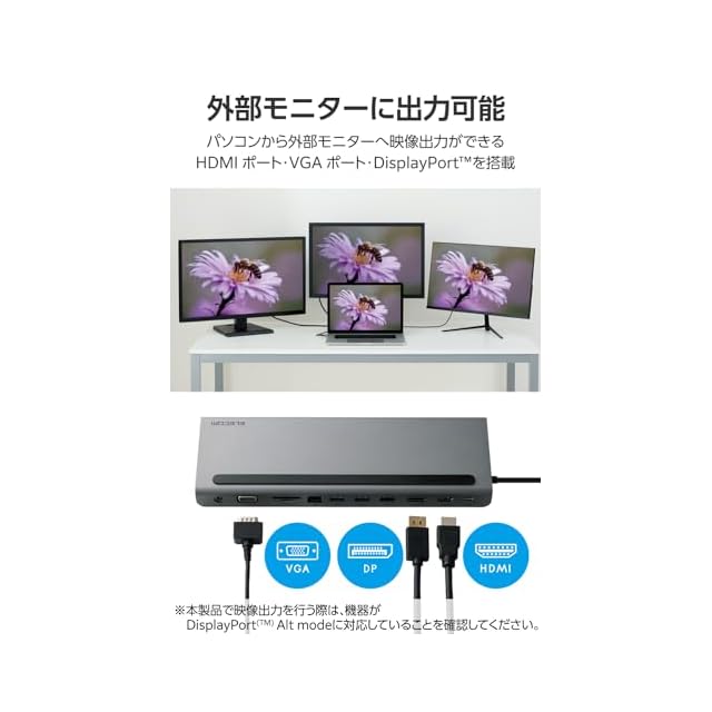 映像出力はHDMI、DisplayPort(TM)、VGAの3ポートを搭載しています。USB Power Deliveryにも対応しています。
