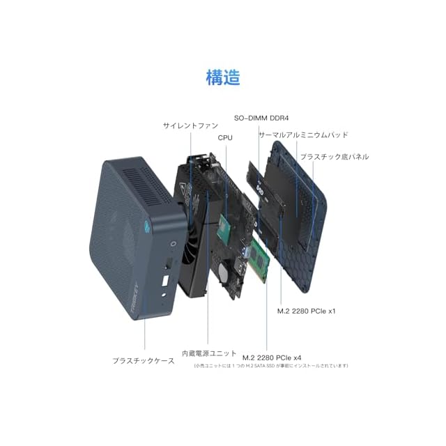 【寸法】120.6*120,6*38mm(ゴム足なし); 【カラー】ミルキーグレー; 【CPU】インテル Twin Lake N150 プロセッサー、最大ターボ周波数 3.6GHz (4C/4T) 6MB キャッシュ最大ターボ; 【グラフィックス】Intel Graphics 24EUs 1000MHz; 【システムディスク】M.2 2280 PCle x4 /SATA SSD 2280; 【ストレージディスク】SSD M.2 2280 PCle x1; 【内部スロット】SO-DIMM DDR4 3200MHz スロット*1; 【ワイヤレスネットワーク】WiFi 5 & Bluetooth 5.0; 【インターフェース】ACジャック*1、USB3。 2(10Gbps)*3、LAN 1000Mbps*2、3.5mmオーディオジャック*1、HDM (最大4K 60Hz)*2、USB2.0 480Mbps*1; 【電源ボタン】1; 【電源LED】1; 【付属品】HDMI 100cm、ACケーブル、ユーザーマニュアル; 【内蔵電源】入力:100-240V~、50/60Hz、1.5A;出力:12V 3.75A; 【動作環境】-10℃~45℃、湿度30%~85%; 【保管環境】-20℃~60℃、湿度10%~90%; 【追加機能】WOL;自動電源オン。