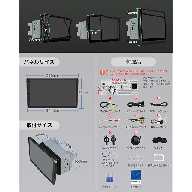 【パネル左右上下角度調整可能&液晶パネルの取付注意事項】液晶パネルと本体の間隔は最大約35mm、任意の角度に调整可能です。ディスプレイの稼働範囲が大きい所、車のダッシュボードの空調口や、2DINナビ取付枠上部の出っ張りや、ハザードスイッチが隠れてしまうなどは回避出来ます。ご購入の前に、コンソールパネルのサイズと形状をご確認ください。本製品のサイズと合わない場合はサービスセンターまで直接お問い合わせ下さい。(ご注意:本製品を取り付ける際に、本体と液晶バネルを分解してから取り付ける場合、本体を取り付けた後に電源在入れた状熊で液晶パネルを装着しないでください。タッチパネルが反応しない原因となります。本体が通電した状態で液晶バネルを装着したことにより、タッチパネルが反応しない場合は、細長いものでRSTボタンを押してリセットしてください。) 【環境に優レい耐衝撃パッゲージ】環境に優しい素材を使用し、耐久性も向上。输送中、保管中の衝撃から商品をしっかり保護します。