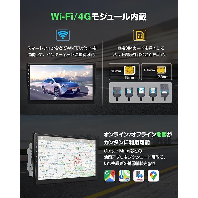 【WIFI/4Gモジュール内蔵】いるんな方法でネット環境利用可能!スマートフォンなどでWi-Fiスポットを作成して、インターネットに接続可能です。また、直接SIMカードを挿入してネット環境を作ることも可能です。そしてアプリをダウンロード&インストールでき、音楽や動画を手軽にお楽しめます。*SIMカード(別途購入必要)は周波数帯域や地域によっては対応できない場合があります。*サポートされている周波数帯域は:LTE-FDD B1/3/8/18/19/21/26/28 LTE-TDD B41 WCDMA B1/6/8/9/19 【オンライン/オンライン地図がカンタンに利用可能】Google Mapsなどの地図アプリをダウンロード可能で、いつも最新の地図情報をget!インターネット不要で地図力ード(EONON G3048 別売り)によって最新の道路情報や簡潔な経路を提供します!