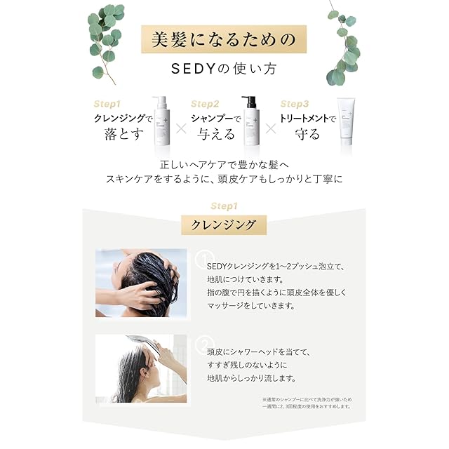 【使い方のポイント】:シャンプーを適量手に出し、しっかりと泡立ててから髪全体になじませ、頭皮全体や髪を優しくマッサージ。頭皮にシャワーヘッドを当てて、すすぎ残しのないようにしっかり流します。