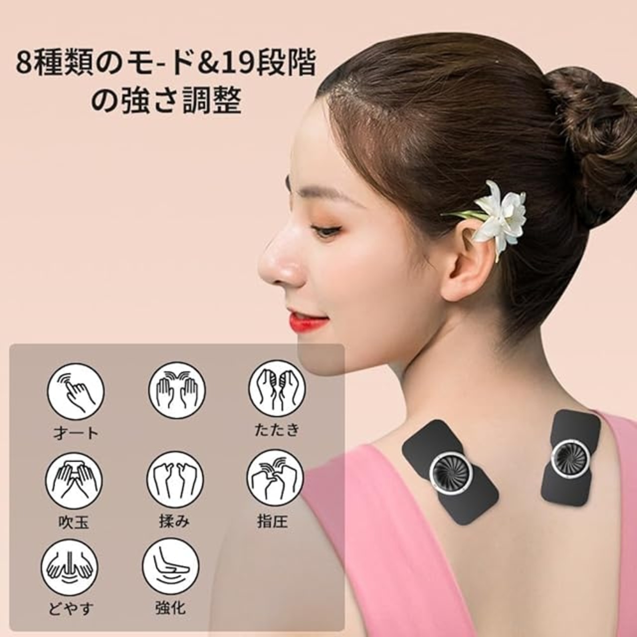 「快適なデザイン」:薄い生地・軽量設計だからどんな体系にもフィット。貼り付けるだけで手軽に筋肉を縮めたり、緩めたりします。足、腕や腰などに多部位対応できます。狙った部位にしっかり貼れて、引き締めに大切な内在筋・外在筋へ的確にアプローチします。<br>「8種類モード&19段階強度」:モード及び電流強度が液晶リモコンに表示されて操作が簡単です。モードが8種類/強度19段階の調整が可能です。モードや強度が組み合わせて軽快なポリリズムの刺激を与え、強力かつ弾力性の刺激で深層の筋力を増加させる。使用者はお好みのモードを選んでお使いいただけます。<br>「充電ボックス・リモコンで操作簡単」:充電ボックスデザインで、充電も収納もできます。充電ボックスに置くだけですぐ充電でき、充電忘れによる電量不足の心配はありません。さらに、背面には三つのボタンがついていて、これはリモコンでもあります。リモコン操作できるので届きにくい箇所に貼っても使いやすくて便利。<br>「コンパクト・幅広く使える」:小型で軽量な設計で、服のポケットや鞄などに入れるサイズで持ち運びに便利です。また、使用中は動作音が非常に静かで、日常生活に、家事や勉強、テレビを見ながら、出張や旅行、通勤などの移動中にも使用できます。時間や場所を選ばず、いつでもどこでもトレーニングを行えます。<br>「品質保証&パッケージ内容」:ご購入日より1年間の保証をいたします、商品に問題があった場合は、販売店までご連絡いただきますと、迅速に対応させていただきます。パッケージ内容:本体×1、パッチ×10、USBケーブル×1、日本語取り扱い説明書×1
