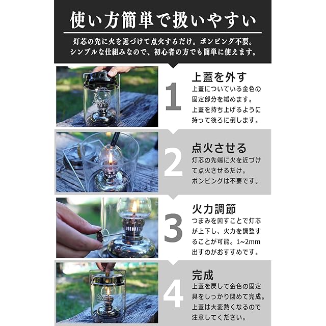 【キャンプ初心者にも扱いやすい】本製品はオイルに浸した芯の先端に着火させるだけのシンプルな仕組みのランタンです。ポンピング不要となりますので、初心者の方でも簡単に扱えます。