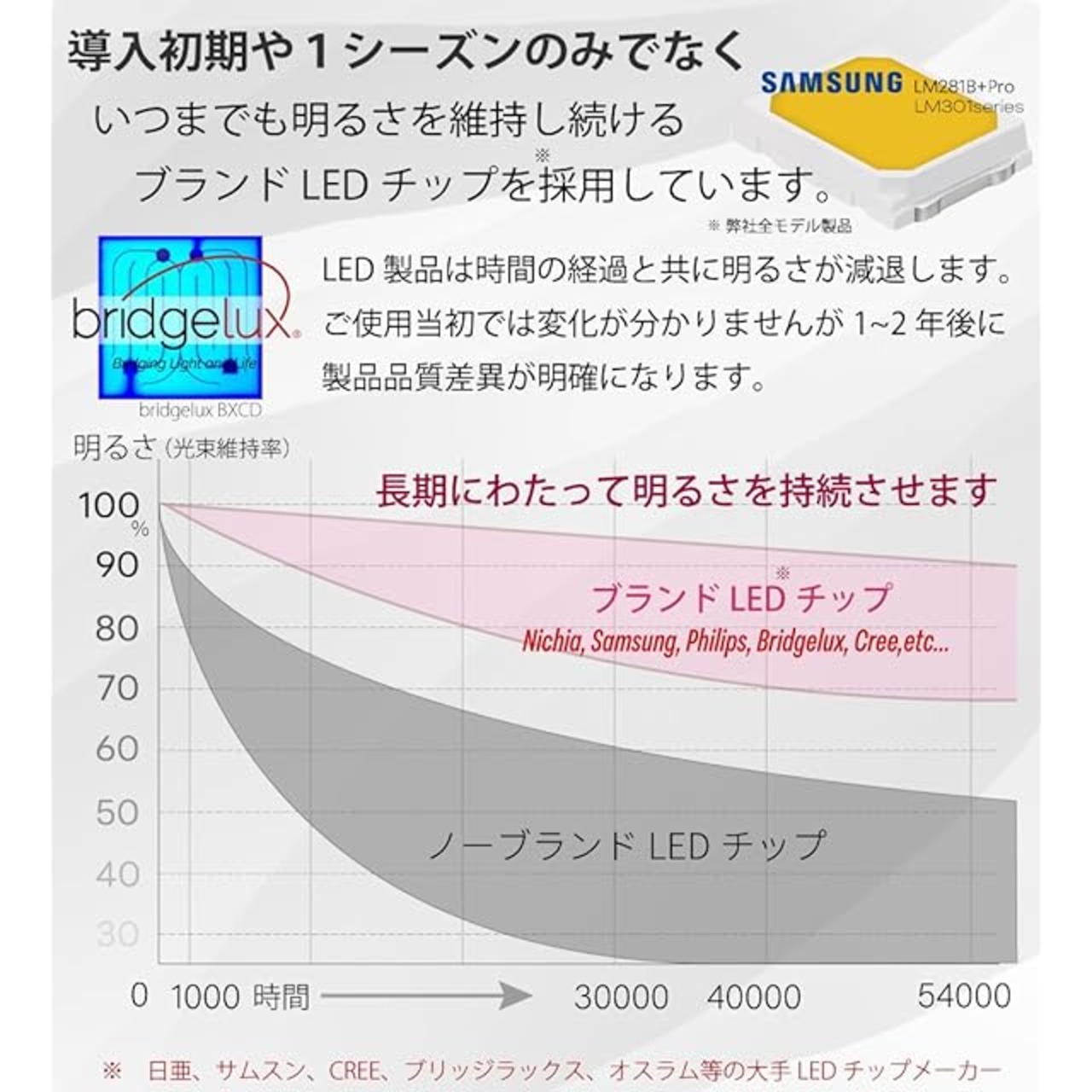 LED素子は太陽光スペクトルのように緩やかなカーブを描くフラットウェーブLEDを搭載しています。製品3年保証