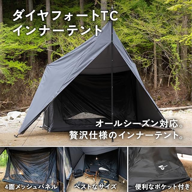 【専用インナーテント】別売りの専用インナーテントを使用することで、さらに快適なキャンプを楽しめます。虫や湿気から守り、さらにプライバシーを確保します。ダイヤフォートTCと一緒に使用することで、全体の機能性と快適性が向上し、より多様なキャンプシーンに対応できます。