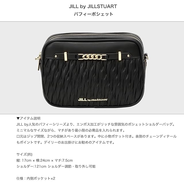 JILL by人気のパフィーシリーズより、エンボス加工がリッチな雰囲気のポシェットショルダーバッグ。 ミニマルなサイズながら、マチがあり最小限の必需品を入れられます。 口元はジップ開閉、2つの収納スペースがあります。中に小物ポケット付き。表側のチェーンディテールもポイントです。 デイリーのお出掛けにお勧めのアイテムです。