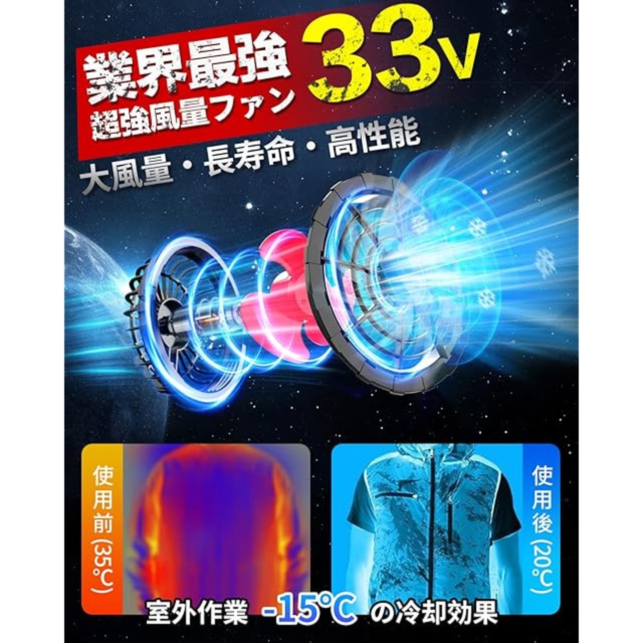 【2025業界超強・33V超高出力ファンバッテリーセット】2025年新作の熱中症対策、33V 超高出力ファンバッテリーセットが登場!従来のファン付きの作業服に取り付けて使用が可能です。ファンバッテリーセットの電源ボタンを押すと、大量の新鮮な空気が服の中を迅速に循環し、服内の汗を素早く乾燥し、蒸し暑い空気を排出し、心地よい感覚を生み出して、圧倒的な涼しさを実現します。パワーが安定で、風量が弱くならないでずっと187ℓ/秒で服内に暴風を送ります。お手持ちのファン付き作業服に取付可能で、レベルアップが可能です。