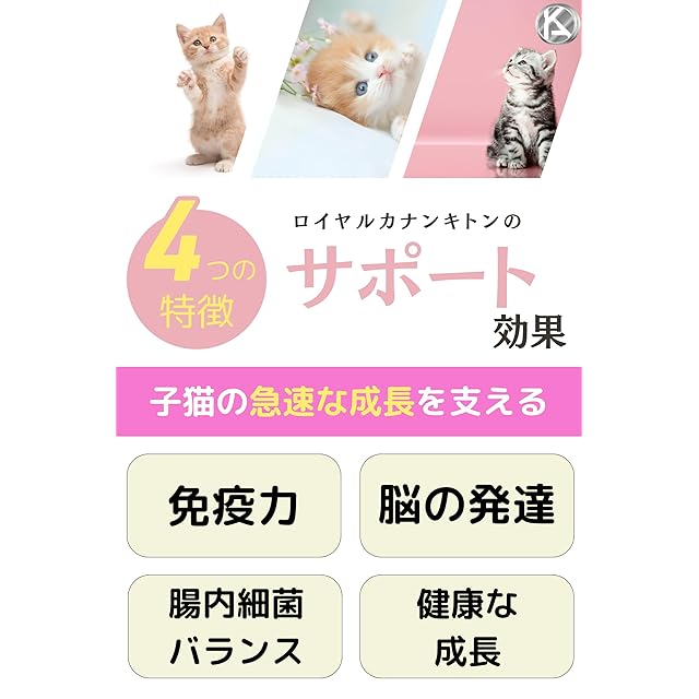 キトンは、子猫の健康な腸内環境をサポートするために、特別に設計された総合栄養食です。 プレバイオティックス(マンナンオリゴ糖)と高消化性タンパク質の組み合わせが、健康的な消化を維持し腸内細菌バランスを整えます。マンナンオリゴ糖は、腸内の善玉菌の成長を促進します。これにより悪玉菌の増殖を抑え、腸内環境を改善します。 プレバイオティクスは消化を助け、栄養の吸収を促進します。これにより、子猫の成長と発達に必要な栄養素を効率よく利用できるようになります。 高消化性タンパク質は子猫の消化器官に優しく、消化をスムーズにします。これにより消化不良や下痢のリスクを減少させます。良質なタンパク質は、子猫の健康な筋肉と組織の発達をサポートします。