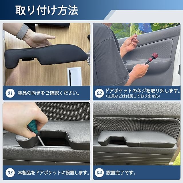 【取り付け簡単】N-VAN サイドアームレスト インストール手順:1:製品の向きをご確認ください。2:ドアポケットのネジを取り外します。3:本製品をドアポケットに設置します。4:設置完了です。