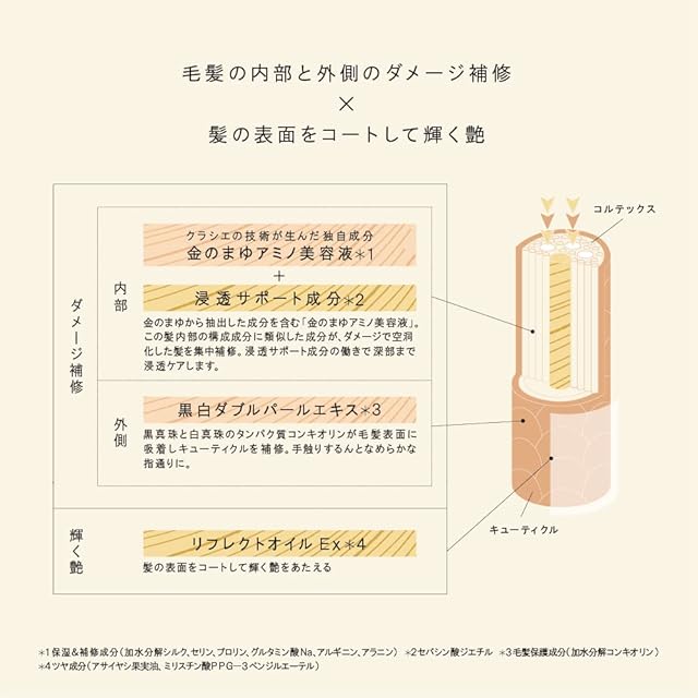 ✅【髪内部のダメージ補修成分"金のまゆアミノ美容液"】金のまゆアミノ美容液に含まれる「金のまゆ」は、タイ北部で栽培され、100万個に1個しか採れない世界でも希少な品種で、アミノ酸を潤沢に含み、高い補修・保湿効果が認められています。