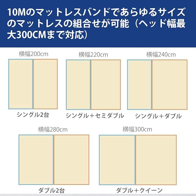 【10メートルの超ロングマットレスバンド】ダブルサイズのマットレス2枚分、ダブル+クイーンのマットレス2枚分にも対応できるので、大家族でも安心です。