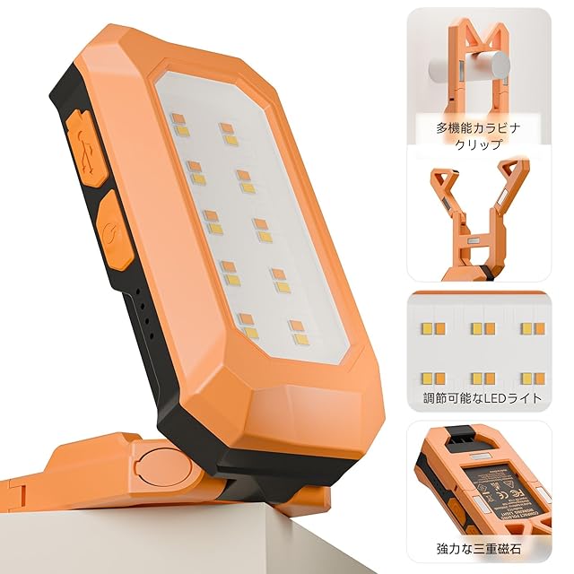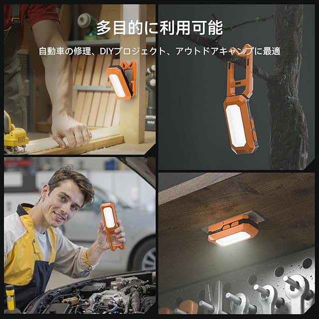 高輝度と長時間使用可能:この充電式作業灯は500ルーメンの明るさを提供し、3段階の調光(高輝度・中輝度・低輝度)が可能です。最大40時間の使用が可能で、車の修理やアウトドア、DIY作業に最適です。