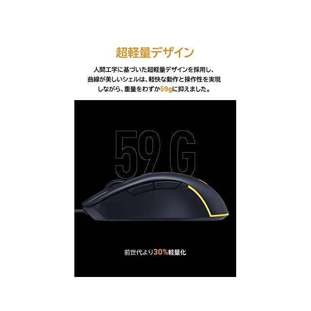 超軽量、人間工学に基づいだ設計:重量わずか59g、右利き向けフォームファクター