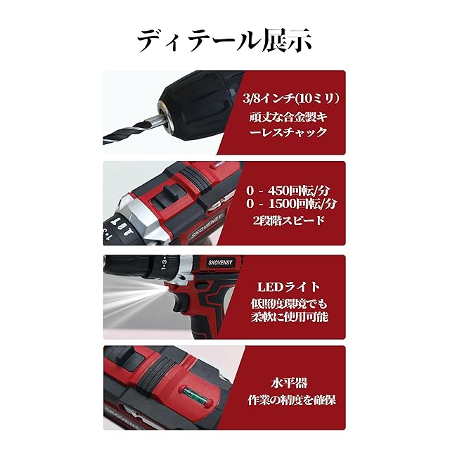 【視認性を向上させるLEDライトと水平器】統合型のLEDライトを搭載した電動ドライバーは、暗い環境でも作業エリアを明るく照らし、視認性を向上させます。これにより、低照度でも効率的な作業が可能です。さらに、内蔵された水平器により精度が向上し、電動ドライバーの作業を迅速かつ便利に進められる設計となっています。