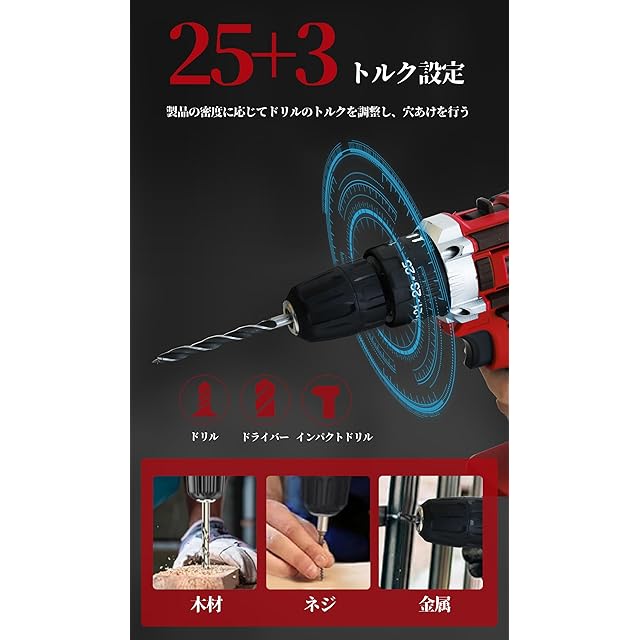 【25+3段階のトルク設定で多用途対応】この電動ドライバーには25+3段階の調整可能なトルク設定があり、ネジ締めや緩めの作業を簡単に切り替えられます。素材の密度に合わせてトルクやスピードを調整することで、木材、セラミック、プラスチック、金属などの正確な穴あけ作業が可能です。電動ドライバーの設計により、作業中にネジの破損や頭外れを防ぎます。