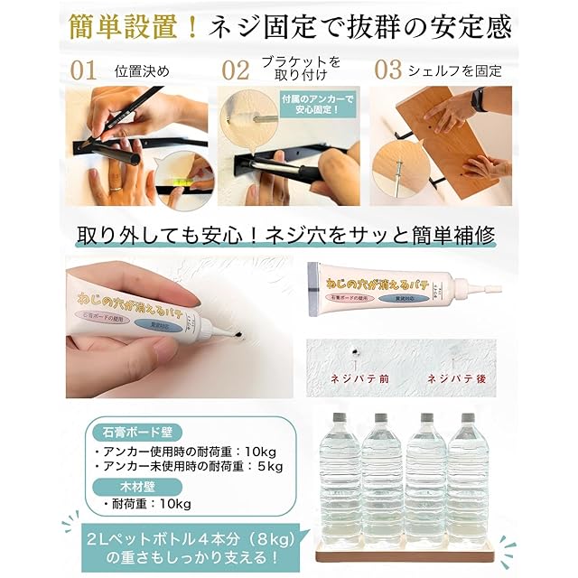 【5分で簡単設置!ネジ穴補修も可能】ネジ・アンカーに加え、必要な工具もすべて付属。初心者でも簡単に取り付けでき、取り付け後のネジ穴は修復用パテで目立たず補修可能。