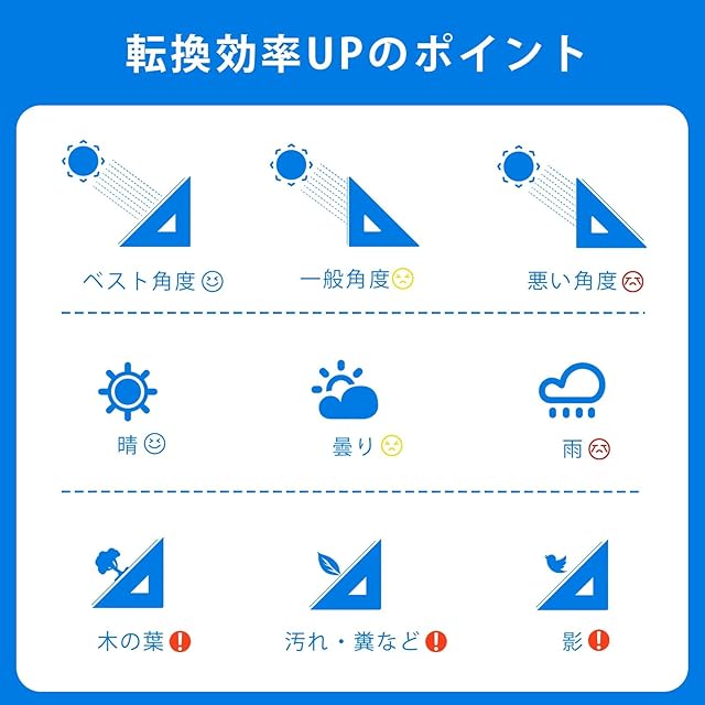【高い転換効率】最大100Wの出力を誇る単結晶パネルを使用し、最大23%の優れたパフォーマンスで効率的な発電を実現します。(天候や環境により発電量は大きく変化します) この高い効率により、より多くの太陽光を効果的に電力に変換し、持続可能なエネルギー供給を実現します。
