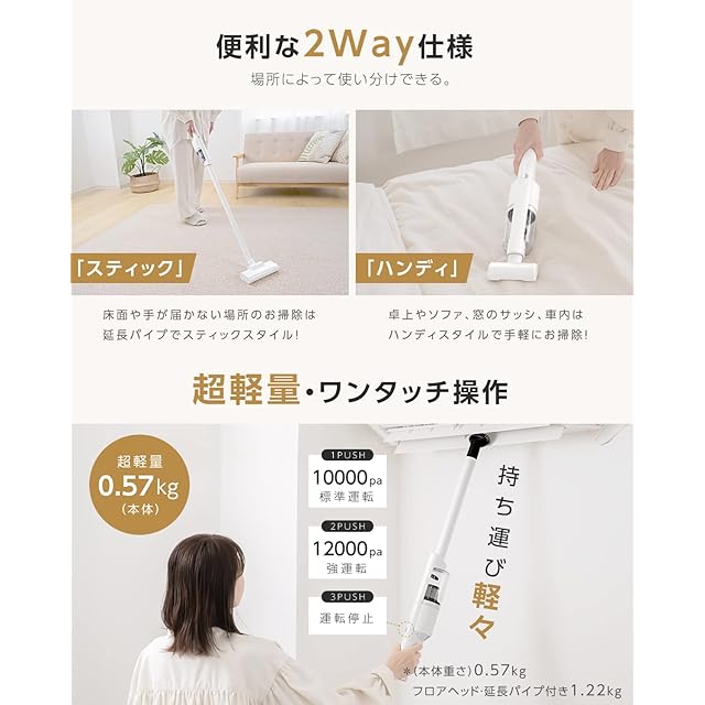 【超軽量0.57kg&操作簡単&お手入れ簡単】0.57kg超軽いのスティック掃除機なので、手元が軽く操作性が向上し、腕への負担が少なく快適に掃除ができます。ワンタッチで電源ON/OFFと2つ運転モードを簡単に切り替えられ、使用者に友好。ダストカップやフィルターは簡単に取り外せて水洗い可能、手入れが楽々!