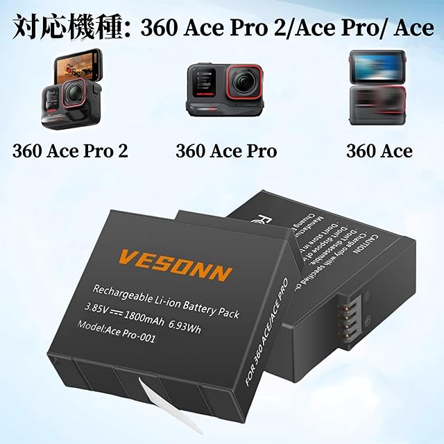【対応機種】360 Ace Pro 2/360 Ace Pro/360 Aceカメラに対応できます。純正品と完全互換。 容量: 1800mAh、電圧: 3.85V 。高品質なリチウム電池を採用して、数回以上の繰り返し充電が可能です。(360 Ace Pro 2/360 Ace Pro/360 Ace電池と100%互換性があります。ご注意:バッテリー非防水!)