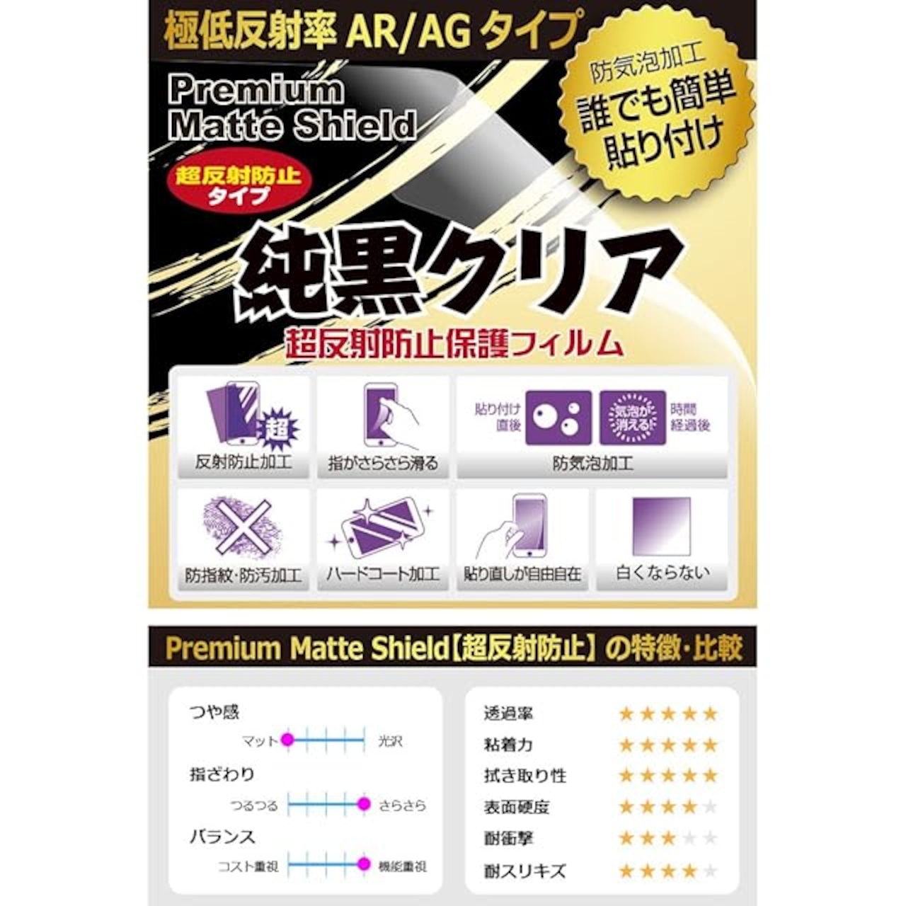 <b>■おどろきの反射防止レベル!</b><br>純黒クリア Premium Matte Shield【超反射防止】保護フィルムは、反射率が脅威の0.5%!保護フィルム業界最高レベルです。<br>一般的な反射低減(アンチグレア)フィルムと比較して大幅に反射を抑えます。<br><br><b>■黒が際立つ! 高透過率</b><br>一般的な反射低減(アンチグレア)フィルムは画面が白っぽくなりますが、この純黒フィルムは高い透過率で白くならず黒が引き締まり、色の再現性や視認性に優れています。<br>反射が気になるカーナビや、デジタルインナーミラーなど車載アイテムにもおすすめです!<br><br><b>■指すべりさらさら防汚加工!ゲーム操作も快適</b><br>さらさらの指滑りで快適な触り心地。フリックやスライドがしやすいので、ゲーム好きな方にイチ押しです。<br>指紋や皮脂汚れをはじく防汚コーティングで、汚れても拭けばすぐにきれいになります。<br><br><b>■気泡の入りにくい特殊な自己吸着タイプ</b><br>接着面は気泡の入りにくい特殊な自己吸着タイプです。素材に柔軟性があり、貼り付け作業も簡単にできます。また、はがすときにガラス製フィルムのように割れてしまうことはありません。<br>貼り直しが何度でもできるので、正しい位置へ貼り付けられるまでやり直すことができます。<br><br><b>■安心の日本製</b><br>最高級グレードの素材を日本国内の弊社工場で加工している Made in Japan です。安心の品質をお届けします。<br>