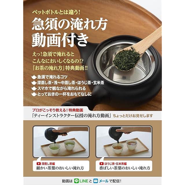〈急須のおいしい淹れ方動画・リーフレット(取扱い説明書)付き〉「え!?こんなにおいしくなるの!?」 <プロが"こっそり"おしえる>お茶のおいしい淹れ方動画付き。 深蒸し茶(細かい茶葉)編/浅蒸し~中蒸し茶(大きい茶葉)編/ほうじ茶・玄米茶編と、茶葉にあった淹れ方を詳しく丁寧にレクチャー!