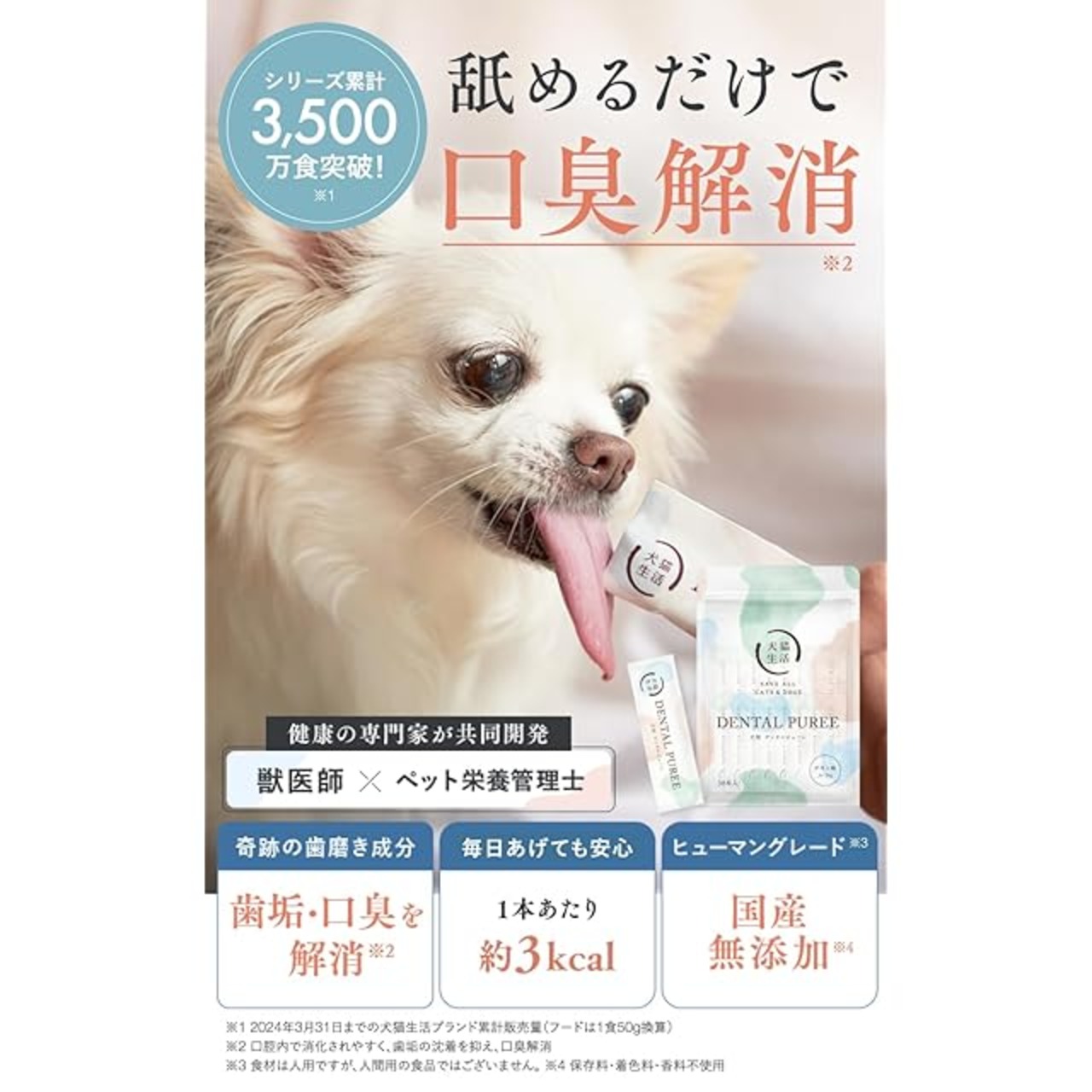 【シリーズ累計販売数5,000万食*1突破】*1 2024年10月31日までの犬猫生活ブランド累計販売量(1食50g換算)<br> 【獣医師×ペット栄養士の共同開発】徹底的な愛犬第一主義のもと、口腔科学に基づく独自の研究で愛犬の健康をサポート。<br> 【天然由来の歯磨き成分】大切な家族のお口の中に入れるものだから全成分天然由来。マスティック樹脂、カテキン配合でお口スッキリ。添加物不使用。<br> 【食べっぷり◎】ほんのり自然な甘さだから警戒心の強いわんちゃんも変わらない食べっぷり。<br> 【個包装ピューレタイプ】個包装なので計量の手間なく簡単。面倒な手間なしでお口の健康を保てます。
