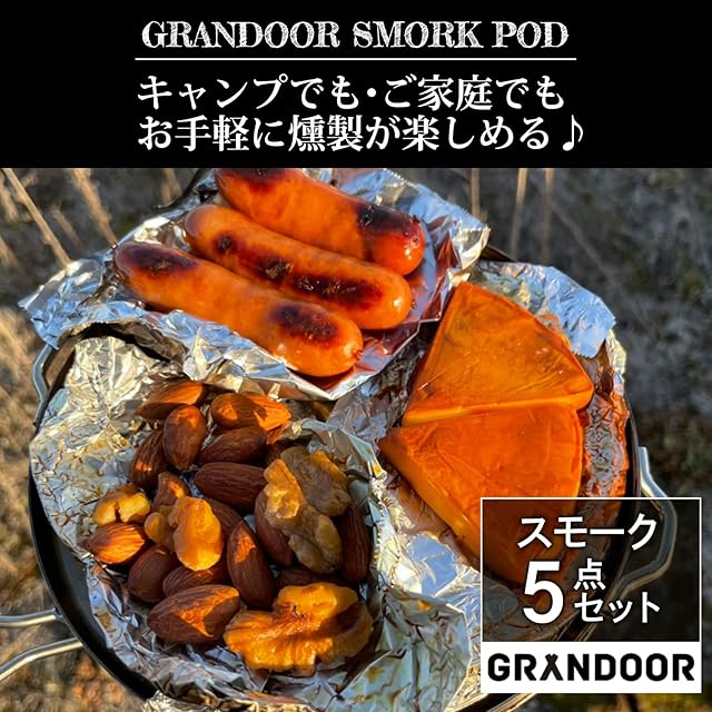 GRANDOORのオリジナル燻製ポッドです。自宅やキャンプで手軽に燻製が楽しめます。おつまみやベーコン、燻製たまご、燻製チーズ等食材も自由自在に選べます。煙が漏れにくい熱燻製専用スモーカーなので手軽につくれてけむりの量も少ないです。すぐに始められるように燻製チップ、燻製網、持ち運びバッグ、燻製レシピ付きです。1.5ℓの容量なので3,4人分の燻製が一回で作れます。IH対応で家庭でも使いやすいです。直径160㎜×高さ90㎜で持ち手部分がコンパクトに折り畳めます。アウトドアブランドGRANDOORが手掛ける燻製鍋です。