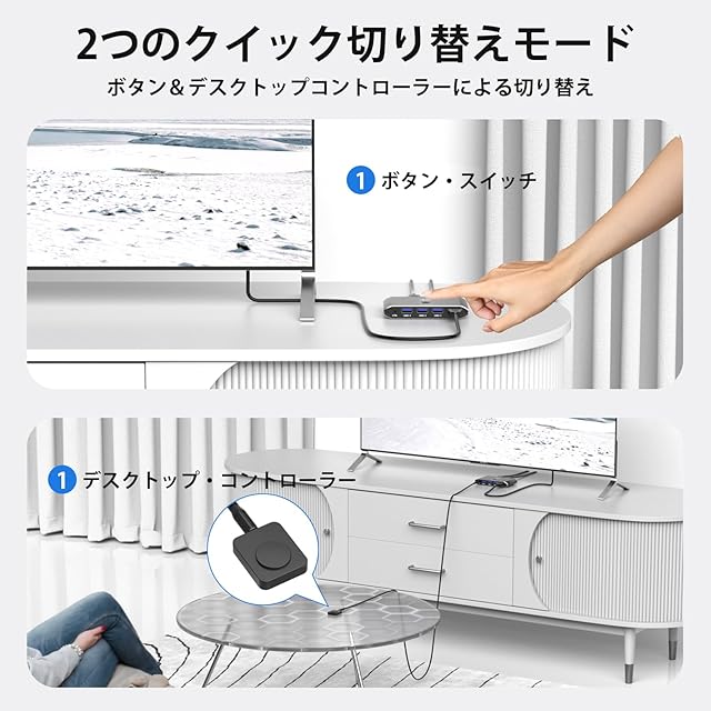 【2入力1出力 HDMI KVMスイッチ】:この2ポートHDMI付きKVMスイッチは、1台のモニタとUSB 3.0キーボード&マウスを共有し、2台のPCをシームレスに制御できます。コンピュータ間をすばやく切り替えて、整頓されたワークスペースを実現します。有線リモコンとボタンコントロールの2つの切り替え方法を搭載。注意:ホットキーによる切り替えはサポートされていません。