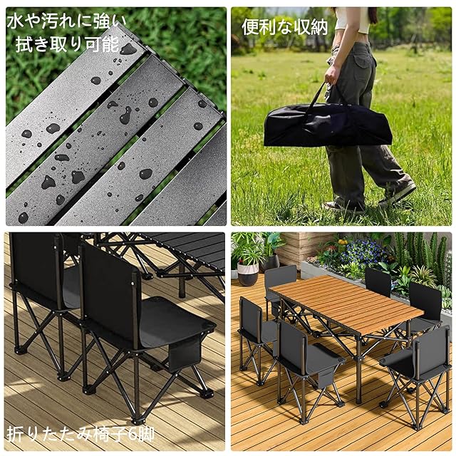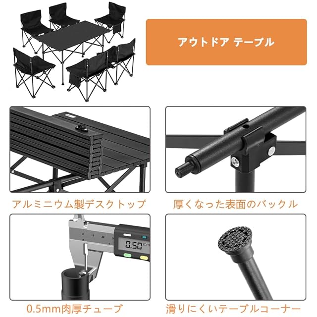 商品名:アウトドア テーブル<br> サイズ:120x55x49cm、チェアサイズ:38x38x65.5cm(6pcs)<br>特徴:テーブルの脚とチェアの底には耐摩耗性の滑り止めが付いており、地形を選ぶことなく幅広い場所で使用できる。テーブルとチェアのフレームに施された金属の三角形構造は、滑らかでしっかりしている。チェアは汗をかいても蒸れずに爽やかで通気性がよく、高反発でシワになりにくい。テーブルの天板はとても広く、いろいろなものを自由に置くことができ、大勢で座っても混雑を感じさせない。<br>