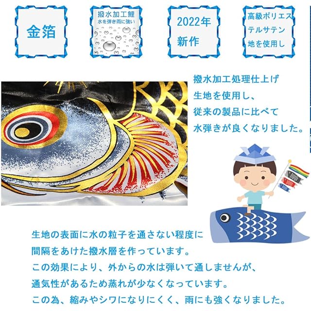 【こいのぼり】高級ポリエステルサテン地を使用し、金箔ぼかし撥水加工、太陽光線を浴びると白銀色に輝きます。豪華絢爛な金箔を鯉のぼり全体に散りばめました。抜けるような5月の青空に、贅沢な輝きが空にきらめく黄金の鯉のぼりが遊んでいます。