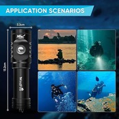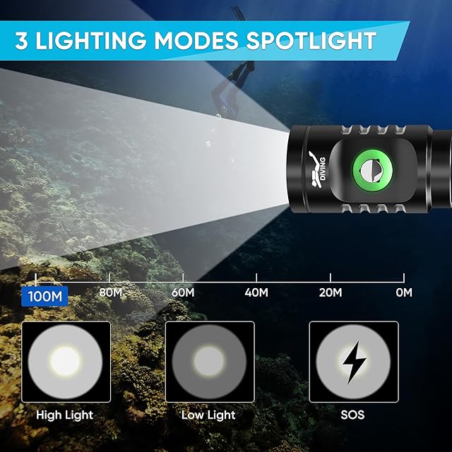 ✪ 【3種類の照明モード潜水トーチ】潜水灯には3種類の照明方式(高低SOS)がある。ボタンを押すだけで異なる明るさを切り替えることができ、異なる水中照明のニーズに対応できます。バッテリ残量を警告するバッテリLED:青信号(30%超)、赤信号(10%~30%)、赤信号点滅(10%未満)。