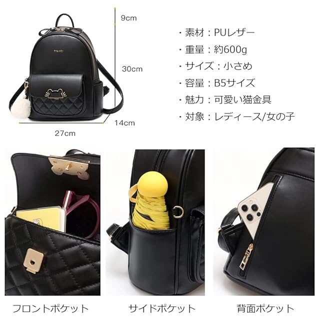 【可愛いリュック】フロントに可愛い猫のロックを使い、おしゃれで安全性がアップします。人気なチャームが付属し、ご用途にあわせて取り外しも簡単にできます。