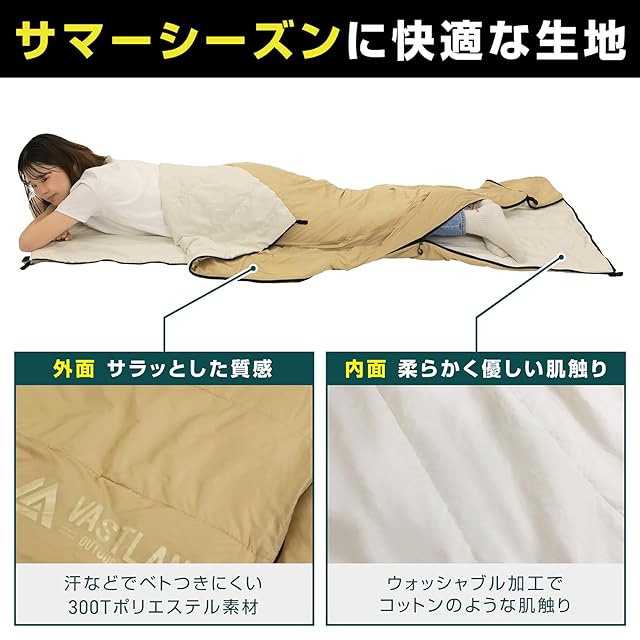 【サマーシーズンに快適な生地】シュラフの外面には汗などでベトつきにくい300Tポリエステル素材を採用し、サラッとした質感に仕上げました。内面にはウォッシャブル加工を施し、柔らかく優しいコットンのような肌触りを実現しています