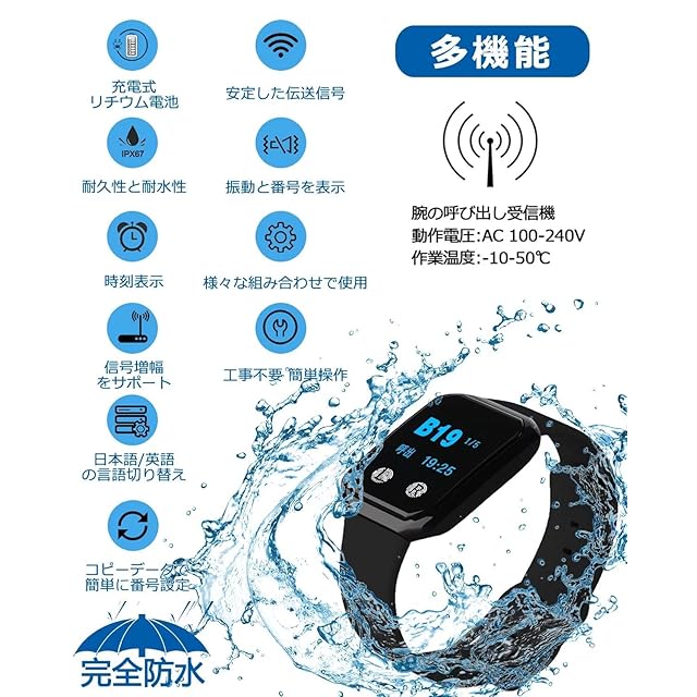 【多機能で完全防水】防水レベル:IPX67;注意方式:表示番号+振動;2種類の呼出表示:3桁の1番号+呼出種類、2桁の4番号;2つの言語の変換:日本語/英語;受信機データのコピー。