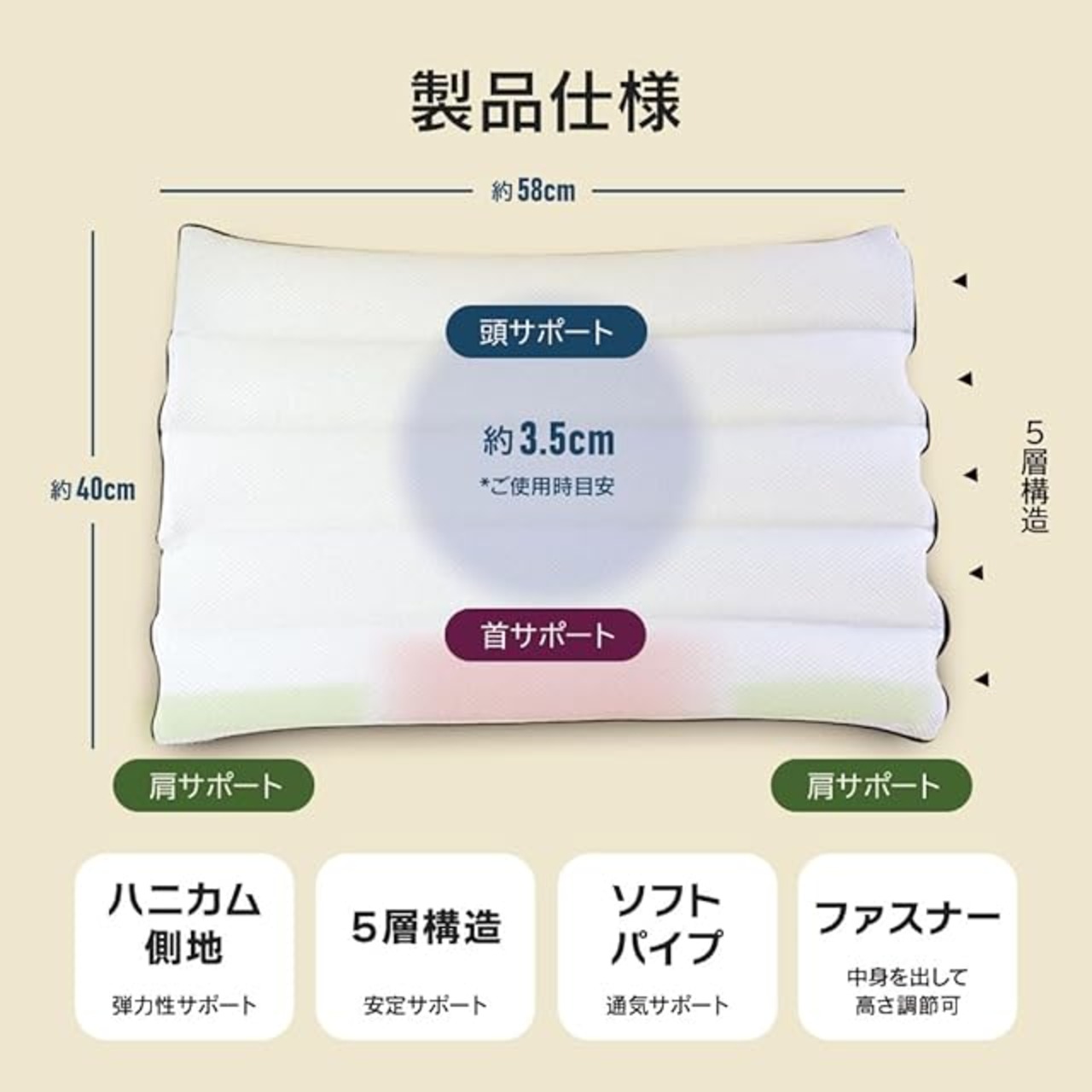 頭・首・肩をやさしく安定し自然な寝姿勢をすすめる低めのパイプ枕です。5層構造を採用しているため、頭の沈み込みが少ないです。