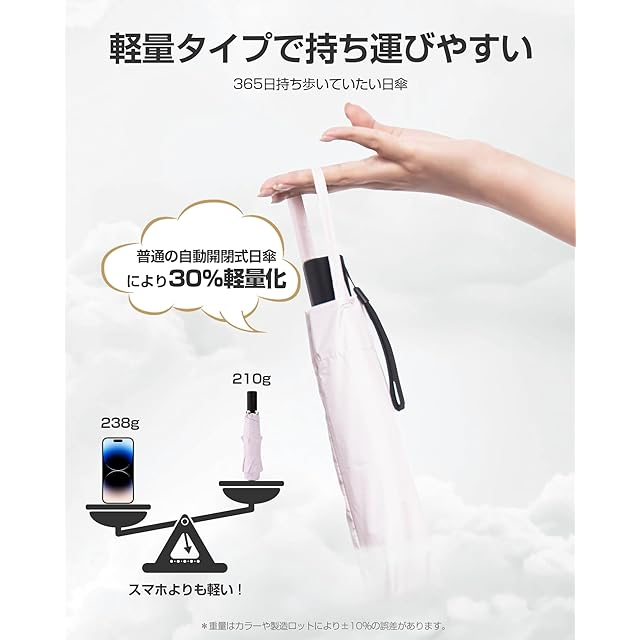 【通常の自動開閉式日傘により30%軽量化・コンパクトで持ち運びに便利】210gと超軽量設計されたこの日傘は、使用時も軽くて手に負担がかかりません。親骨は52cmで、100cmの弧長があり、成年男性でもしっかりカバーします。折りたたむとわずか4.5cmの厚さで、カバンに入れてもかさばらず、外出時に持ち運びやすいです。