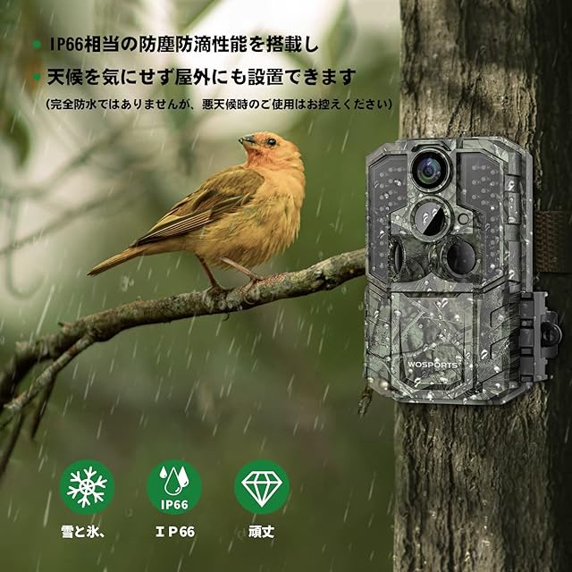 【IP66級防水・防塵仕様 & 120°超広検知範囲 & 設置とっても簡単!】IP66相当の防塵防滴性能を搭載し、天候を気にせず屋外にも設置できます。 (完全防水ではありませんが、悪天候時のご使用はお控えください。※雨による浸水故障は保証適用外となります。 ※水中では使用できません。)柱や木に巻き付ける固定ベルト、壁やコンクリート用の固定金具を付属しており、撮影したい場所に簡単に設置できます。配線不要、 一般的な監視カメラと比べて、弊社のトレイルカメラは乾電池式とDCV12電源の両方利用可能で、配線工事不要、設置工事費不要て安価に設置ができます。装置とっても簡単!