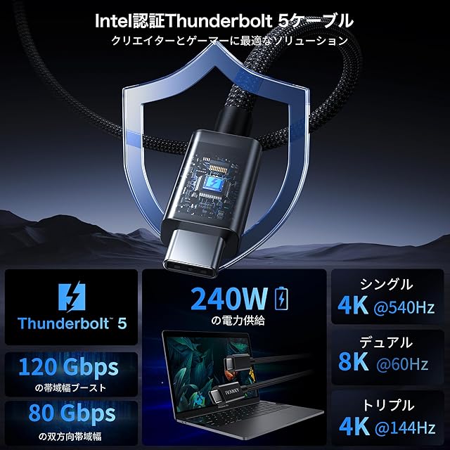 「Intel正規認証品」本製品はIntel の認証を取得し、Thunderbolt 5 デバイスとの安定した互換性を確保し、データ転送をより安定に。互換性の心配なし、信頼性も抜群。ほかの非認証製品は性能が不安定で、互換性が低く、セキュリティリスクも存在します。Intel 認証を選んで、効率的で快適な体験を楽しみましょう!